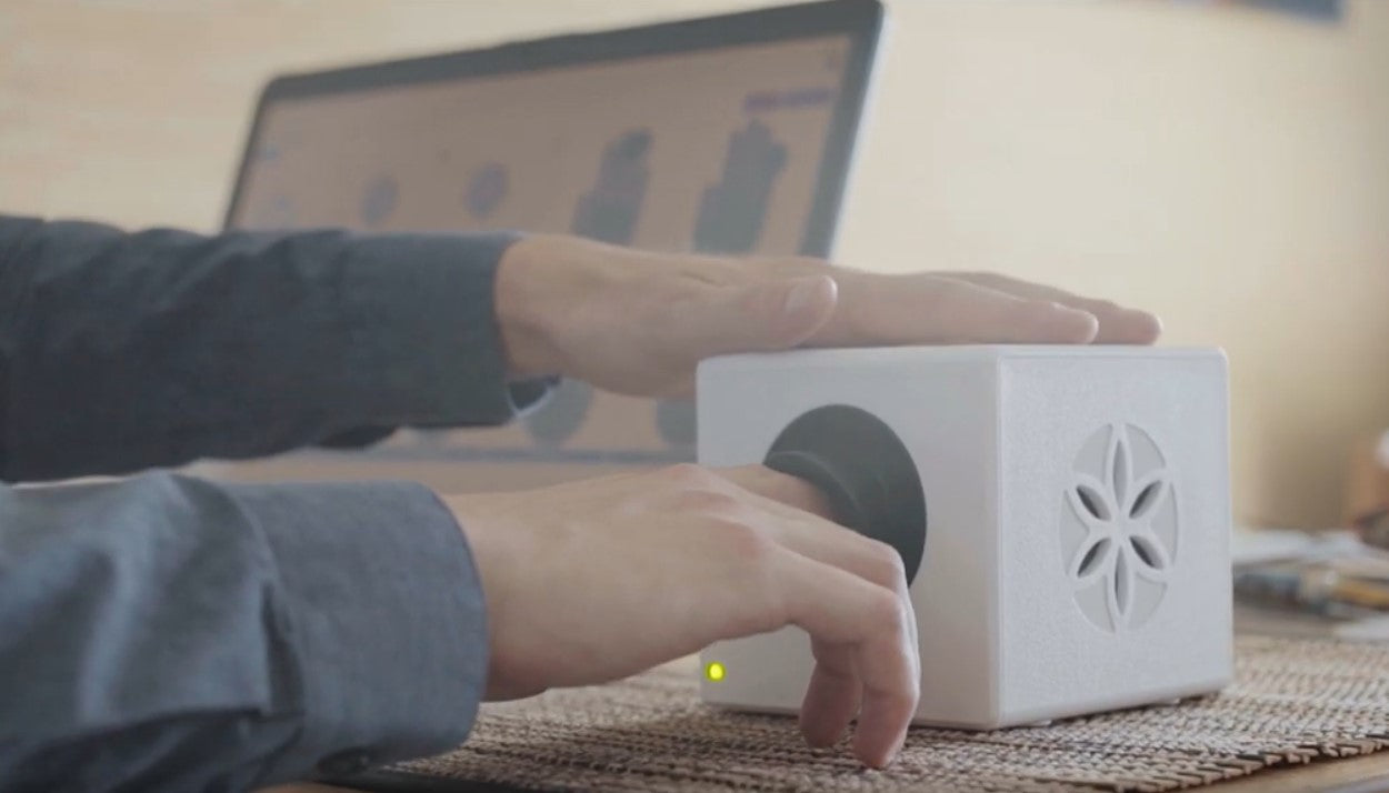 Each fingertip is placed briefly on the sensor. A high-voltage impulse triggers an electro-photonic emission that is instantly recorded.